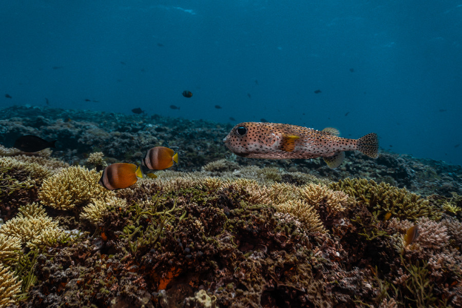 The reef features a gentle slope that transitions into deeper waters, covered in a mix of hard and soft corals teeming with marine life. Schools of tropical fish—such as angelfish, butterflyfish, and parrotfish—are commonly seen weaving through the coral, while occasional sightings of reef sharks, turtles, and reef rays add an element of excitement.
